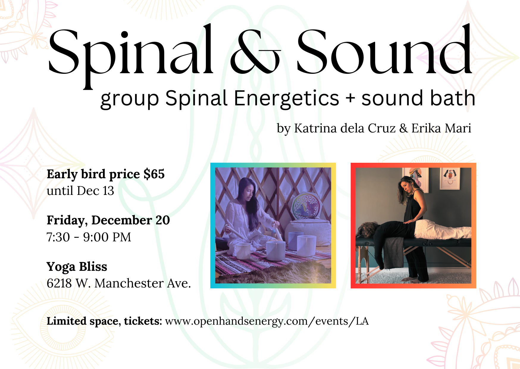 Please join Erika Mari of Open Hands Energy and Katrina dela Cruz of Fire Moon Medicines for a journey in Spinal Energetics & Sound.